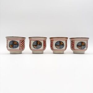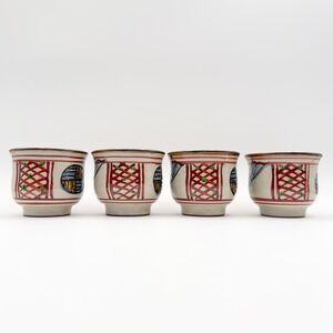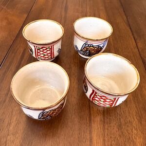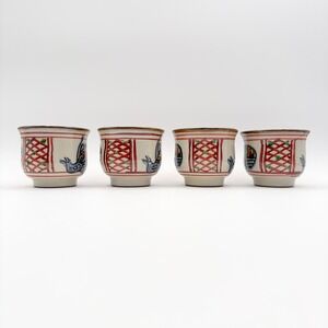 Japanese Hand Painted Okinawa Tsuboya-yaki Pottery Stoneware Tea Cups Set of Four w Birds Reds Blues Golds Vintage