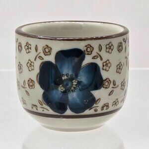 Japanese Import Ware presents a 7-piece sake set in ceramic with a large blue and small brown flowers motif on a cream ground, made in Japan in the 2000s. The set includes a carafe, two sake cups, two side bowls, and two chopstick rests, all outlined in warm brown for a coordinated look. The floral pattern reads contemporary Japanese with folk-inspired charm, ideal for weeknight sushi, a home bar cart, or display shelf decor.