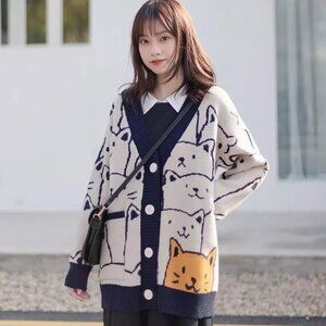 Japanese Kawaii Cartoon V Neck Cozy Cardigan Cute Kitty Cat Knit Sweater Medium