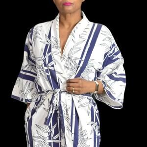 Vintage Epitome kimono robe FEATURES a bamboo stripe pattern and wrap silhouette. Short wide sleeves. Long length. Self fabric belt. Made in Japan.