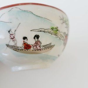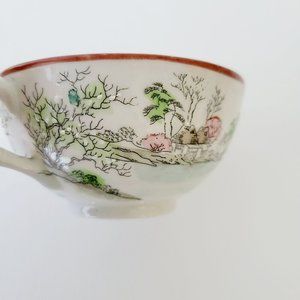 Japanese Kutani Landscape Teacups Saucers Vintage Nippon Red Trim Lake Mountain