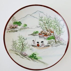 Vintage Nippon Kutani Landscape Teacup & Saucers set exquisitely depicts Japanese mountains and lakes. Hand-painted with a Burgundy red trim, this porcelain decor piece adds Asian elegance to any setting.