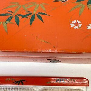 Japanese Lacquered Box and Comb Set Birds Bamboo Vintage Hand Painted MCM