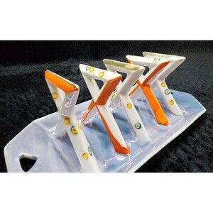 This rare Japanese Art Deco toast rack is a striking example of early 20th-century design, combining bold geometric lines with vibrant hand-painted details. The sculptural X form dividersfinished in glossy white, vivid orange, and playful dotted accentscreate a functional piece that doubles as modernist décor. The base features a soft iridescent luster glaze that shifts gently in the light, a hallmark of Japanese export ceramics from the era.