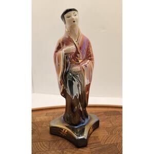 Japanese Lusterware Iridescent Pink and Black Geisha in Kimono Figurine Statue
