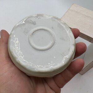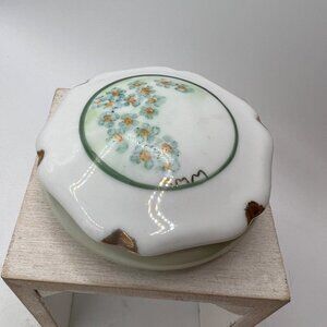 Hand-painted with blue flowers in circle in the center and matching flowers in circle in the center and matching flowers inside circular china box. The box is circular in shape and a reference to a cultural tradition of circular keepsake boxes native to Japan.