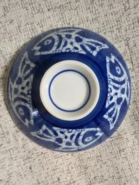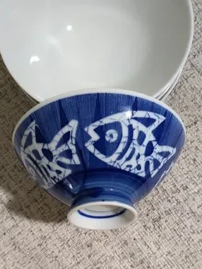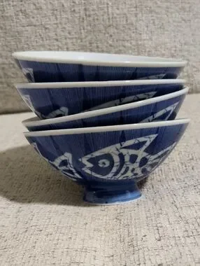 Set of 4 like-new ceramic rice bowls with fish pattern in classic blue and white. Never used. Appx 4.5 inches in diameter, 2 inches high with footed bottoms. Great for dipping sauces, appetizers, soup, food prep, side dishes, and ... rice!