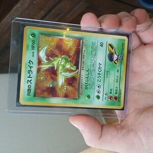 Japanese version Rocket's Scyther from the Gym Heroes set, card is in mint condition. Holographic and rare, card is set in a hard plastic sleeve.