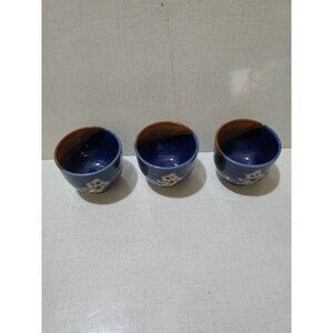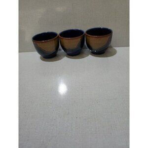 Japanese Sake Cup Set of 3 Blue Brown Drip Glaze Pottery Wabi Sabi