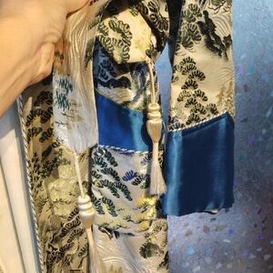 1940/50's Japanese Smoking Jacket with belt. This awesome piece has a few stains on the inside and on collar around the neck (see pictures). No tag. It's s royal blue with beige and hints of yellow. Chest pocket. Full length measuring approx 52" from shoulder. Sleeve measurement is approx 24". Shoulder to shoulder approx 21".