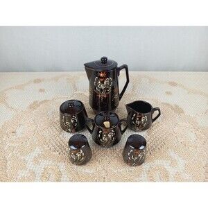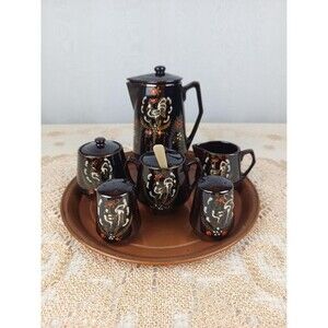 This vintage Japanese style tea set was hand painted n the early 60s. Includes a tea pot, sugar and creamer bowls, an extra matching lidded dish and salt and pepper shakers. Background is a very dark chocolate brown. Painting includes rooster and floral imagery.