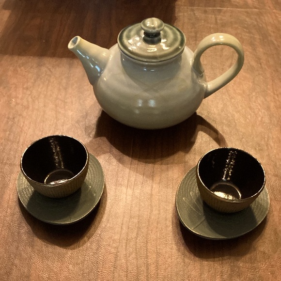 Japanese cast iron tea cups and saucers with Dragonfly design. Made in Japan. Porcelain inside cast iron tea cups. Elegant set matched with ceramic teapot made by LaDolce Vita, Mirage Collection. Tea set not purchased together originally, but the teapot compliments the cups and saucer beautifully.