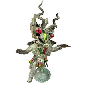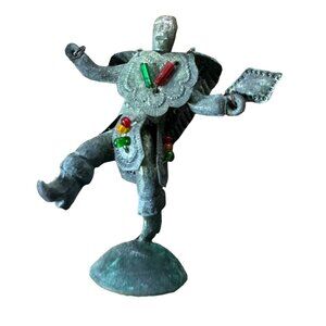 This handcrafted ethnic metal figurine features intricate detailing and vibrant bead embellishments. It serves as a unique decorative piece for any space.