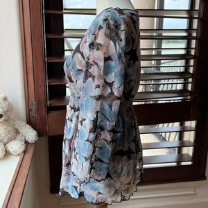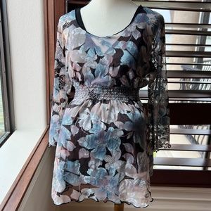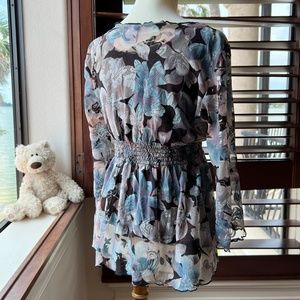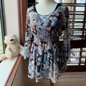 Crossover black sleeveless top is layered with a sheer printed long-sleeve, scoop-neck top that has ruffled edges and a shirred waist.