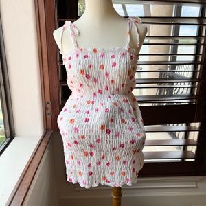 The shirred-stretch top with ruffle hem and neck has self-tie shoulder straps.