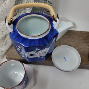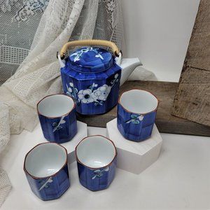 Japanese White Blue Floral Hand Painted Tea Pot & 4 Cup Set Made in Japan Vintag