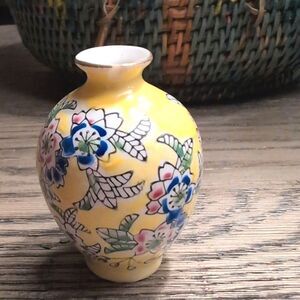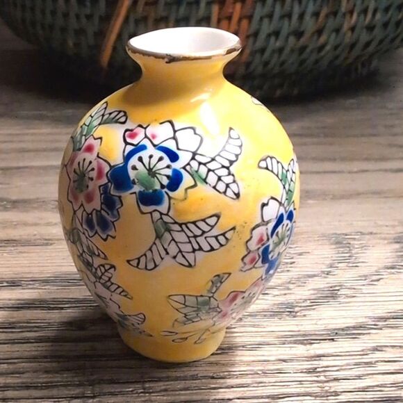 Vintage Japanese Yellow Floral Mini Bud Vase. Lovely blue, white, pink, and green florals on this petite vase accented with gold trim on the rim. Great gift for you or your favorite collector.