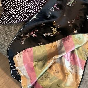 Beautiful Y2K, TANGYI brand, Asian Fashion inspired, full length, short sleeve dress with intricate cloth buttons with knot ends that snap a diagonal chest piece closed. The inside of the fabric is beautiful pastel stripes that show the other side of the floral pattern on the outside and it shows through when you walk. The outer flowers are stitched with a shiny, metallic thread. I got this dress at a very eccentric shop in Los Angeles. The tag says it’s a size 42. I would call it a Medium. This very captivating dress has slits at the bottom on both sides.