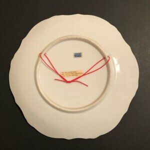 Finish decorating that bare corner of your room with this beautiful Japanese plate featuring two robins. They sit on realistic green branches with tiny pink spring flowers. Plate has raised embroidery looking pattern and is finished with gilt edging. For decorative use only and measures approximately 8” across.