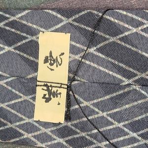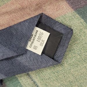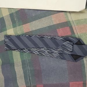 NWT Japanese silk tie. Navy striped background with criss-cross stripe pattern that looks white or silver at a distance, but up close is actually multi-colored. 100% silk. Early 2000s.