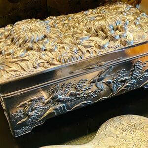 ♥️ Japanese Meiji Silver Chrysanthemum Box High Relief Repoussé Antique