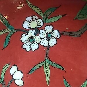 Enhance your home decor with this stunning floral red Japanese porcelainware bowl. The vibrant red background is beautifully complemented by intricate white and green floral designs. Perfect for adding a touch of elegance to any room. This piece of porcelainware was decorated in Hong Kong and is approximately 6 inches in diameter.