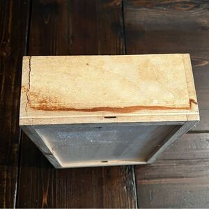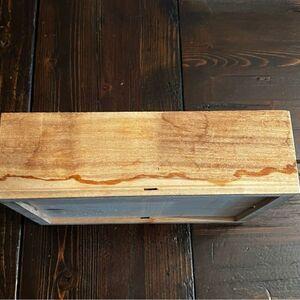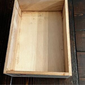 Rustic wooden storage box with natural wood tones. Perfect for organizing small items. The item has a Japanese writing on one side. The box is 11” L x 7 1/2” W x 3 1/2” H. This item will be a great addition to your decor.