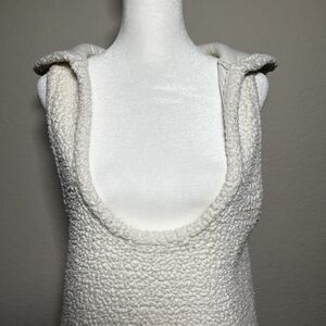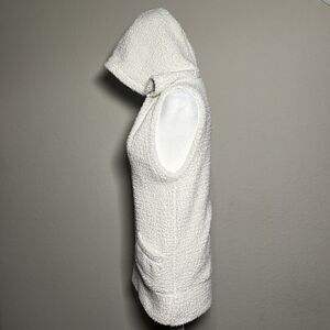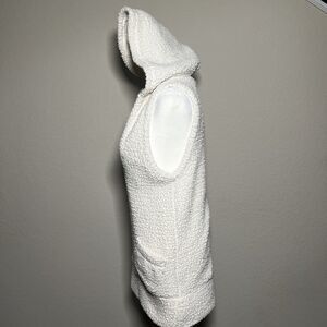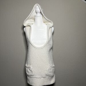This is a stylish Cele Gossip hooded vest from Japan, featuring a fleece fabric with a Sherpa lining in ivory color. It is designed in a solid pattern, suitable for outdoor occasions. The size is medium, with a petite fit. The vest has a Tokyo Fashion Kawaii style, perfect for women looking for a cozy and fashionable layering piece.