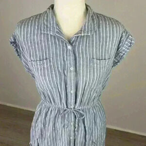 Has been worn many times. Material is worn from washing and there is a small hole in the dress. Material is 60% cotton and 40% rayon. Super cute!