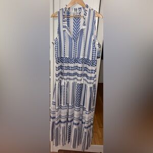 Stylish blue and white midi dress with geometric patterns. Sleeveless design for a modern look. Perfect for versatile wear.