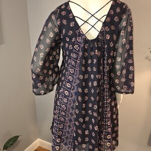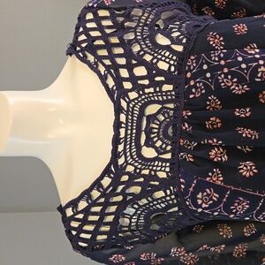 Pretty navy blue with pink floral print trapeze dress from Japna features crochet accent at neckline, 3/4 sleeves, and criss cross back detail in Size Small.