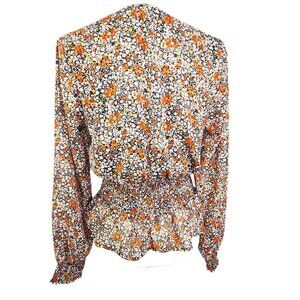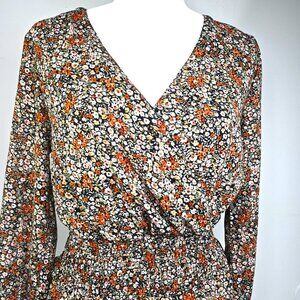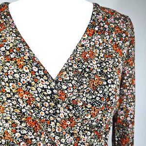 Japna Brown Black Faux Wrap Long Sleeve Ditsy Floral Boho Peplum Top