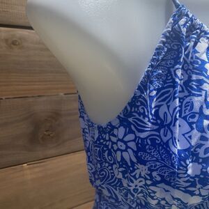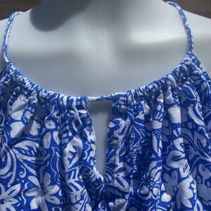 Japna Chic Blue White Cropped Halter with Key Hole Front Open Back Tied Top Med
