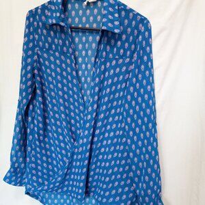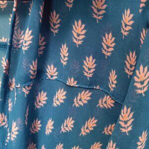 Gorgeous blouse by Japna. It is teal with a dusty mauve wheat-like design. It is a surplice style or crossover style and drapes beautifully. The fabric is lightweight and semi-sheer. You will need a camisole underneath. It hangs lower in the back than the front and has sort of a loose knot in the front at the hips/ It is long sleeved and in excellent condition.