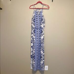 Elegant Japna maxi dress with floral blue design. Sleeveless and stylish. Ideal for warm weather.