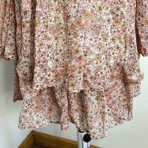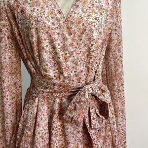 Japna Floral Faux Wrap Chiffon Dress Womens Size Medium Tiered Long Sleeves Pink
