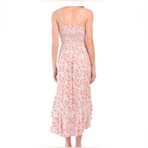 Chic high low dress by Japna. Features vibrant orange floral design. Perfect for any occasion.