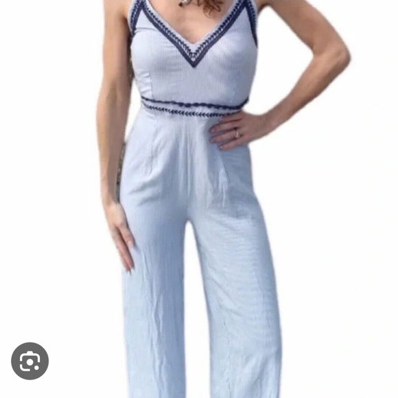Japna Jumpsuit Womens XL Blue White Striped Embroidered V Neck Smocked Back