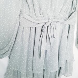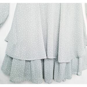 Japna Light Green & White Polka Dot,Floral Tiered Career Casual Dress Size L, Material - Shell - 100% Polyester, Lining - 100% Polyester, Machine Wash Cold, Tumble Dry Low, Made in India, V-Neck, Button Center Back with Keyhole, Lined, Sheer Long Sleeve Elastic Ends, Smocked Tie Waist,