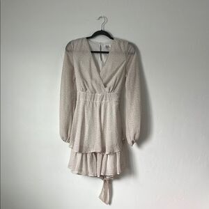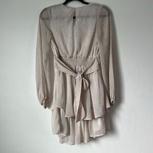 Japna dress, taupe mini dress, ruffle tiered dress, boho style, spring event dress, modest mini dress, brunch outfit, neutral long sleeve dress, women’s size medium, floral