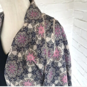 Bohemian medallion print in pink and purple with crochet insets.