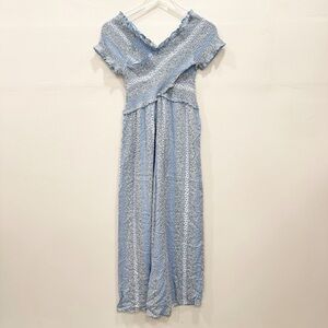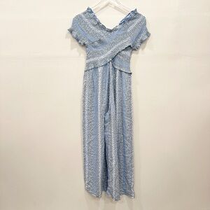 Japna Micro Floral Off The Shoulder Crossfront Wide Leg Jumpsuit Blue Small