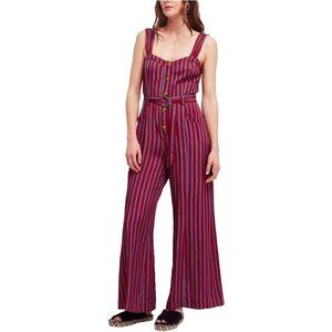 Stylish jumpsuit with vibrant stripes. Features button details and adjustable straps. Ideal for casual outings.