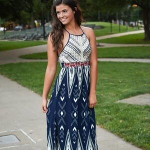 Japna New Size M Halter Style Maxi Dress Rayon Blue Cream Red Aztec Boho Print