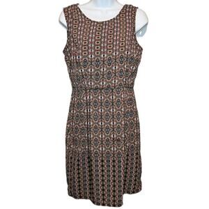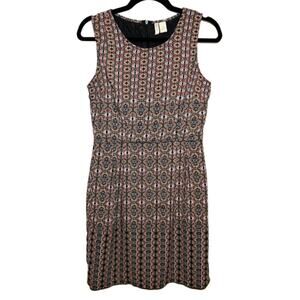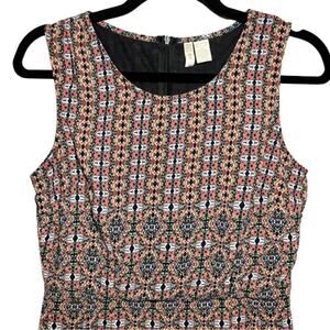 Fitted at the waist with a slight a-line silhouette and a small slit in the back makes for a very flattering look. Patterned with shades of rust, green, blue, white and pink - it is absolutely gorgeous. Lightweight sheath material with a lightweight black liner underneath.