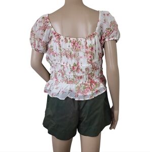 Japna Puff Sleeve Pleated Gathered Pink Floral Blouse