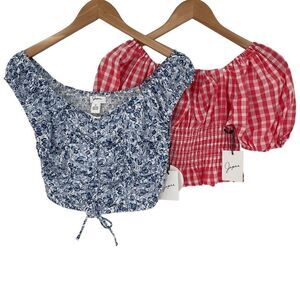 Japna Set Of 2 Smock Crop Tops Floral Plaid Short Sleeve Juniors Small Blue Red