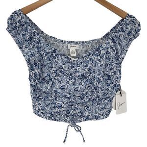 Blue Top - Smocked with a front ruched tie that can be used to wear it different ways. Short cap sleeves. Floral pattern. 100% Rayon.
