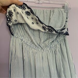Boho coastal style strapless jumpsuit from Japna. Flowy top with embroidery florals with a blue & white stripe pattern. Features wide leg pants and pockets.