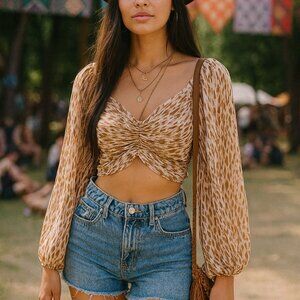 Channel free-spirited style with this Japna off-the-shoulder crop top in earthy tan and brown hues. Featuring a flattering sweetheart neckline, ruched bodice, and smocked back for added stretch and comfort, this lightweight blouse is perfect for festival wear, western flair, or breezy summer days. The cropped fit makes it ideal for pairing with high-waisted jeans, skirts, or layered jewelry for that perfect boho look.